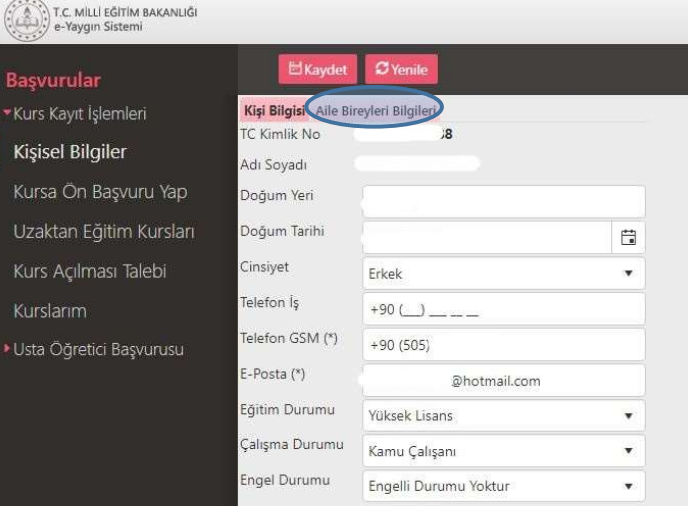 15 yaş altındaysanız; e-devlet kullanıcısı olmayan 15 yaş altında yer alan kursiyerler için kurs kayıtları yasal temsilcileri tarafından e-yaygın sistemi üzerinden yapılmaktadır. Kişisel bilgilerin doldurulması esnasında Aile bireyleri bilgileri sekmesi tıklanarak, açılan ekranda çocuk bilgisi açılır. Bilgilerin doğruluğundan emin olduktan sonra “kaydet” butonu tıklanarak işlem tamamlanır.